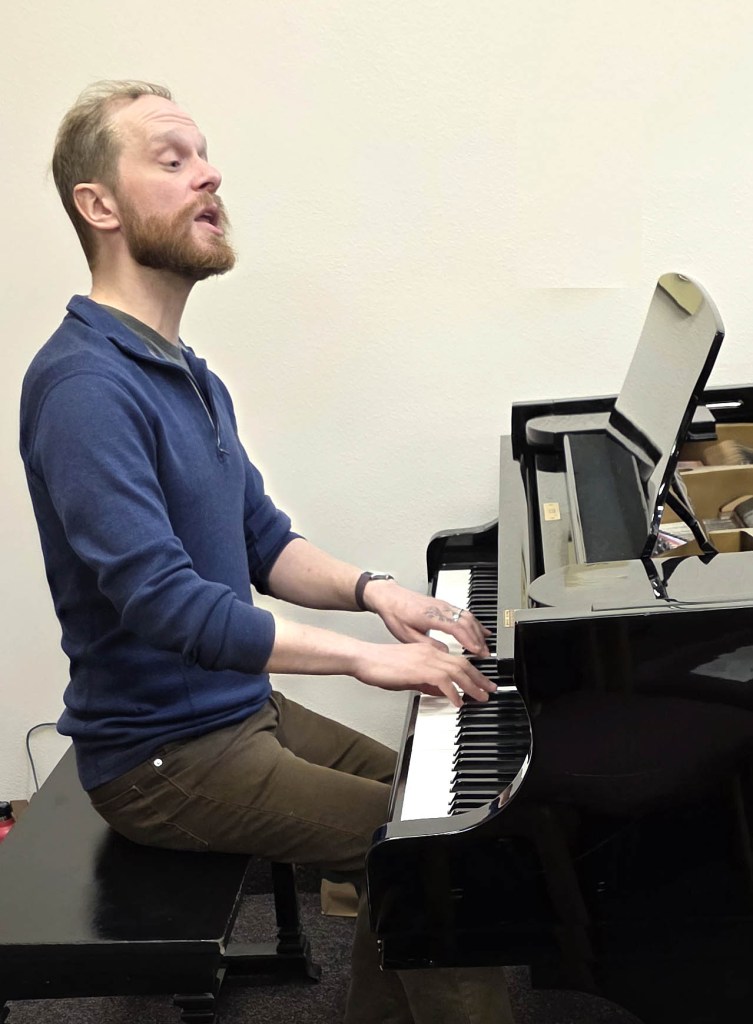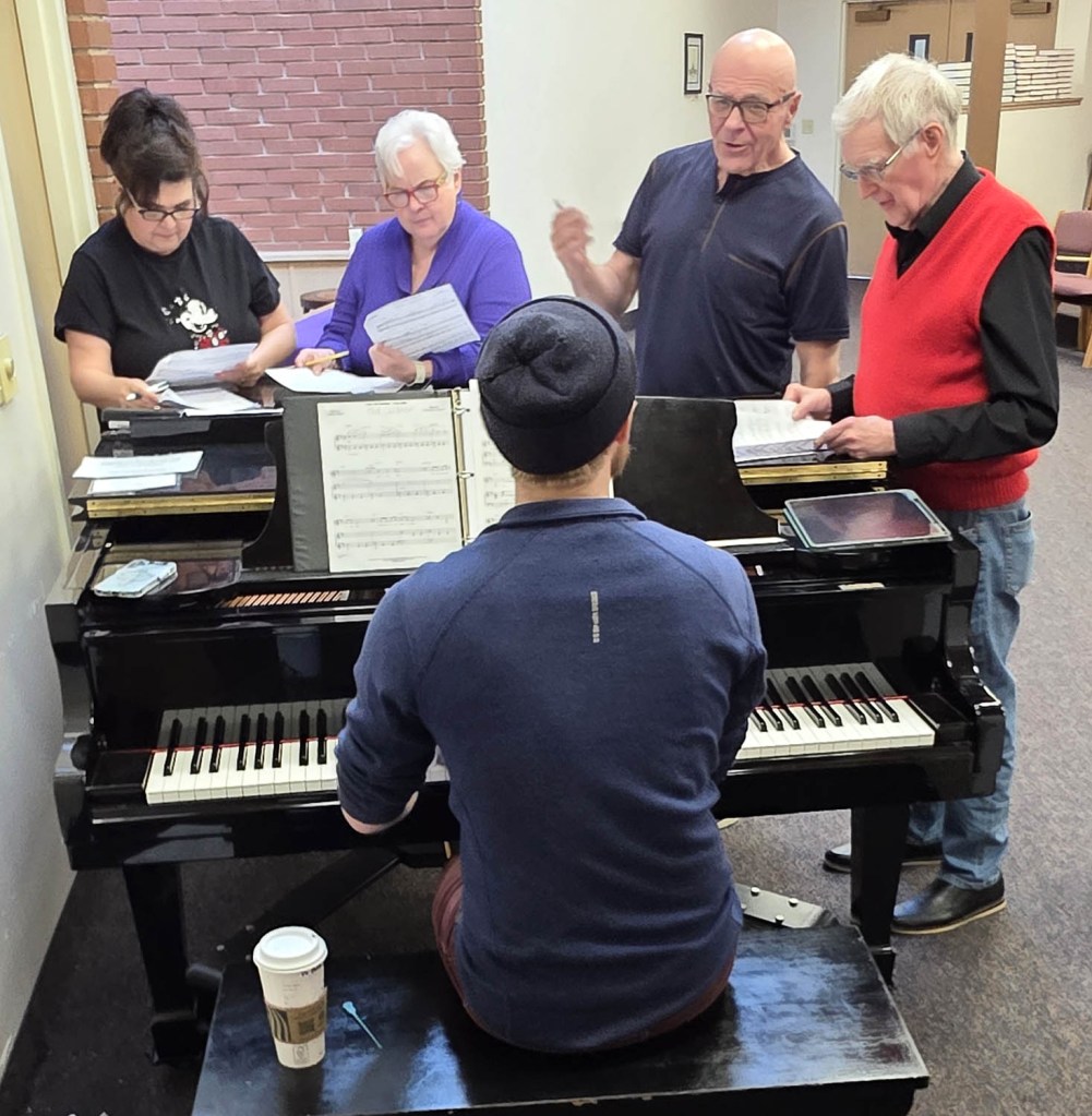 As February flips to March, our rehearsals are focusing on getting small-group songs just right. Here’s a look at a little musical “sausage” being made. It starts with a quartet gathered around Music Director Mak Kastelic at the piano…