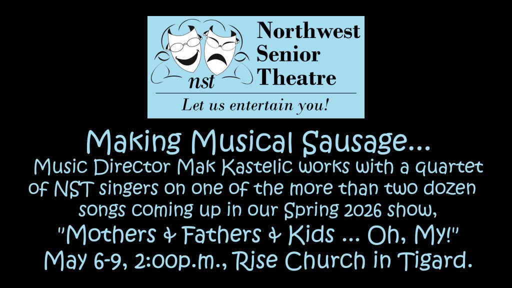 Rehearsals have begun for Mothers & Fathers & Kids … Oh, My!, NST’s May 2026 show. It’s a show that crosses genres as well as generations, and touches a range of emotions as we use music to look at families and family relationships. It should be a fun production, just in time for Mothers’ Day.