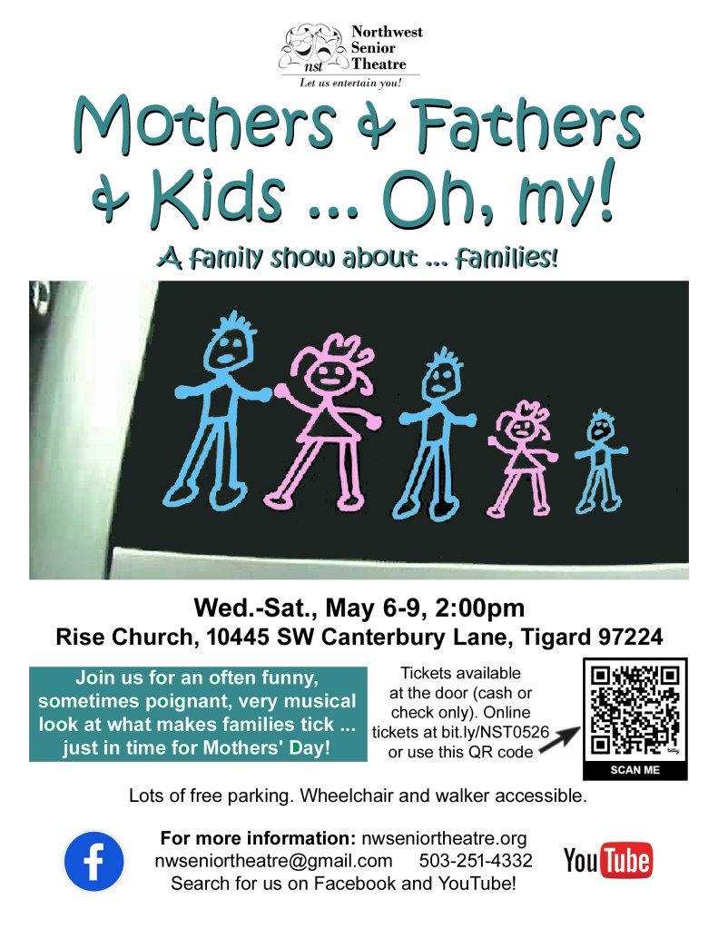 Our next show, Mothers and Fathers and Kids ,,, Oh My!, runs May 6-9, 2026 at 2:00pm each day at Rise Church in Tigard.